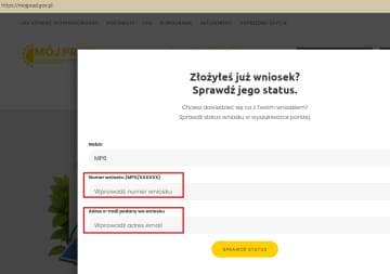 Status swojego wniosku można sprawdzić klikając w prawym górnym rogu strony , gdzie po otwarciu nowego okna należy wpisać numer wniosku oraz adres mail